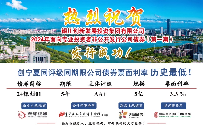8月30日,銀川創(chuàng)新發(fā)展投資集團(tuán)有限公司2024年第一期面向?qū)I(yè)投資者非公開(kāi)發(fā)行公司債券成功發(fā)行。本期債券發(fā)行規(guī)模5億元,期限:5年,票面利率:3.5%,創(chuàng)寧夏區(qū)域內(nèi)5年期私募債發(fā)行利率歷史最低。本期債券的成功發(fā)行,充分體現(xiàn)了資本市場(chǎng)對(duì)銀川市和創(chuàng)投集團(tuán)的認(rèn)可,降低了集團(tuán)融資成本,為集團(tuán)公司后續(xù)服務(wù)銀川市產(chǎn)業(yè)發(fā)展奠定了良好基礎(chǔ)。